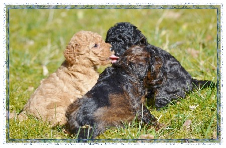 Mittlerweile wird der gesamte Welpenauslauf genutzt und es finden auch spielerische Raufereien statt und was man mit Spielzeug macht , dass haben die Kleinen auch schon entdeckt !
